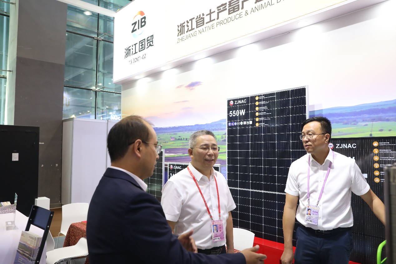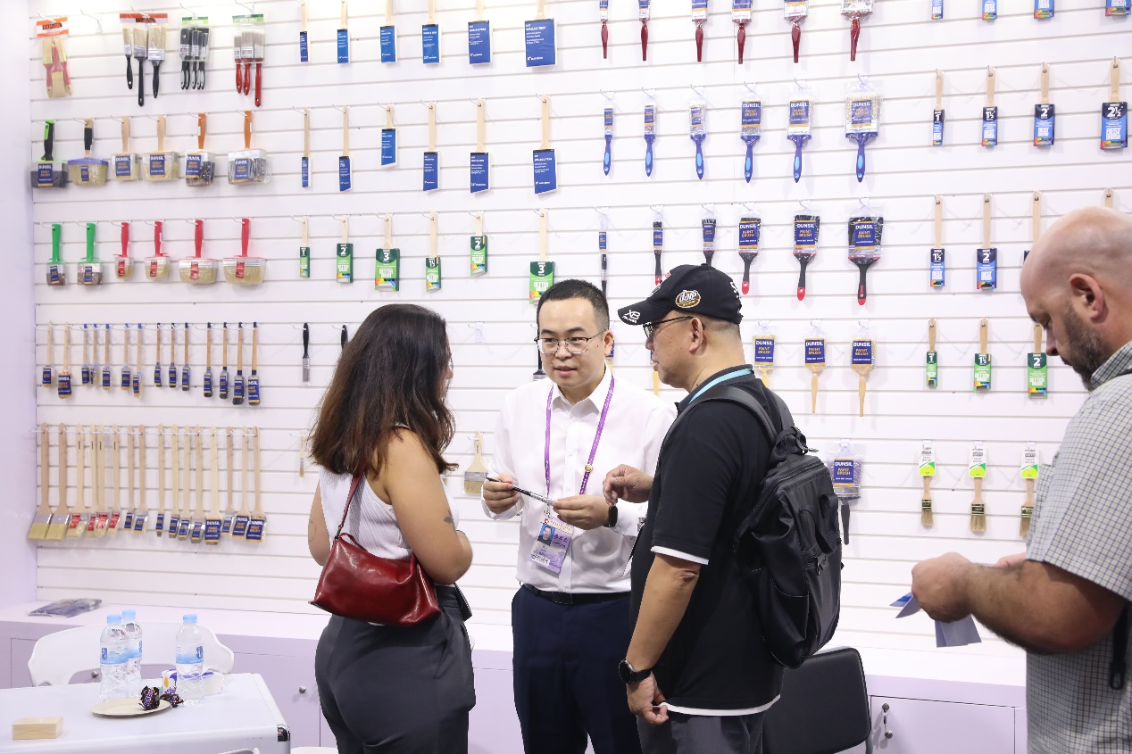 在第一期廣交會上,浙江土畜包括下屬輕工、盛力公司共有工具、五金、新能源等在內的29個展位。公司老牌出口拳頭產品的漆刷展位積極順應綠色環保發展趨勢,帶來了用回收材料制成的油漆滾筒刷,并攜此產品參加了本屆廣交會新品發布活動。新能源展位作為新質生產力產品開發前線,其光伏組件產品吸引了大量外商駐足和洽談。