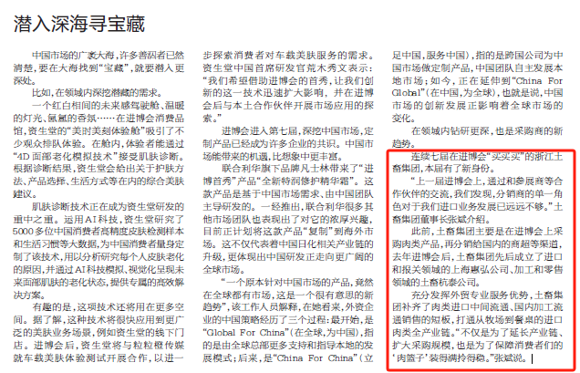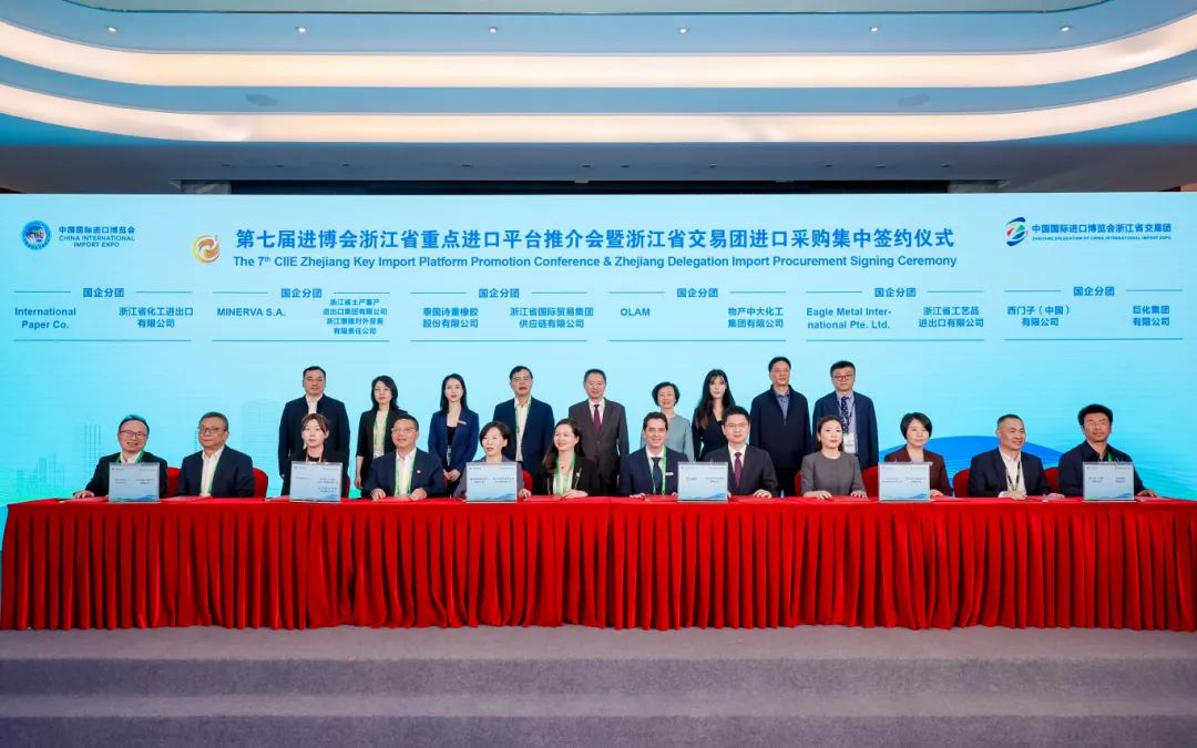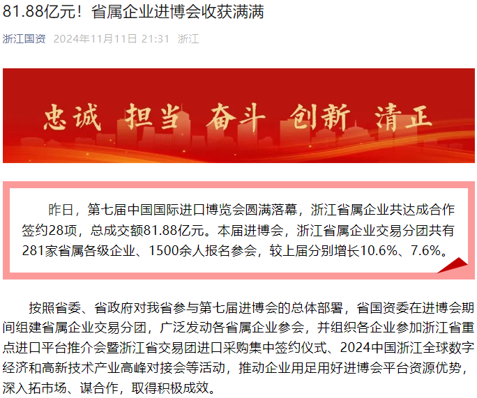 11月5日至10日,第七屆中國國際進口博覽會(進博會)在上海國家會展中心舉辦。本屆進博會以“新時代,共享未來”為主題,吸引了來自152個國家、地區和國際組織的參展商。浙江土畜組織旗下6家企業的30余名代表積極參會。浙江日報、潮新聞、浙江衛視、浙江國資等多家媒體對浙江土畜參會進行了報道。