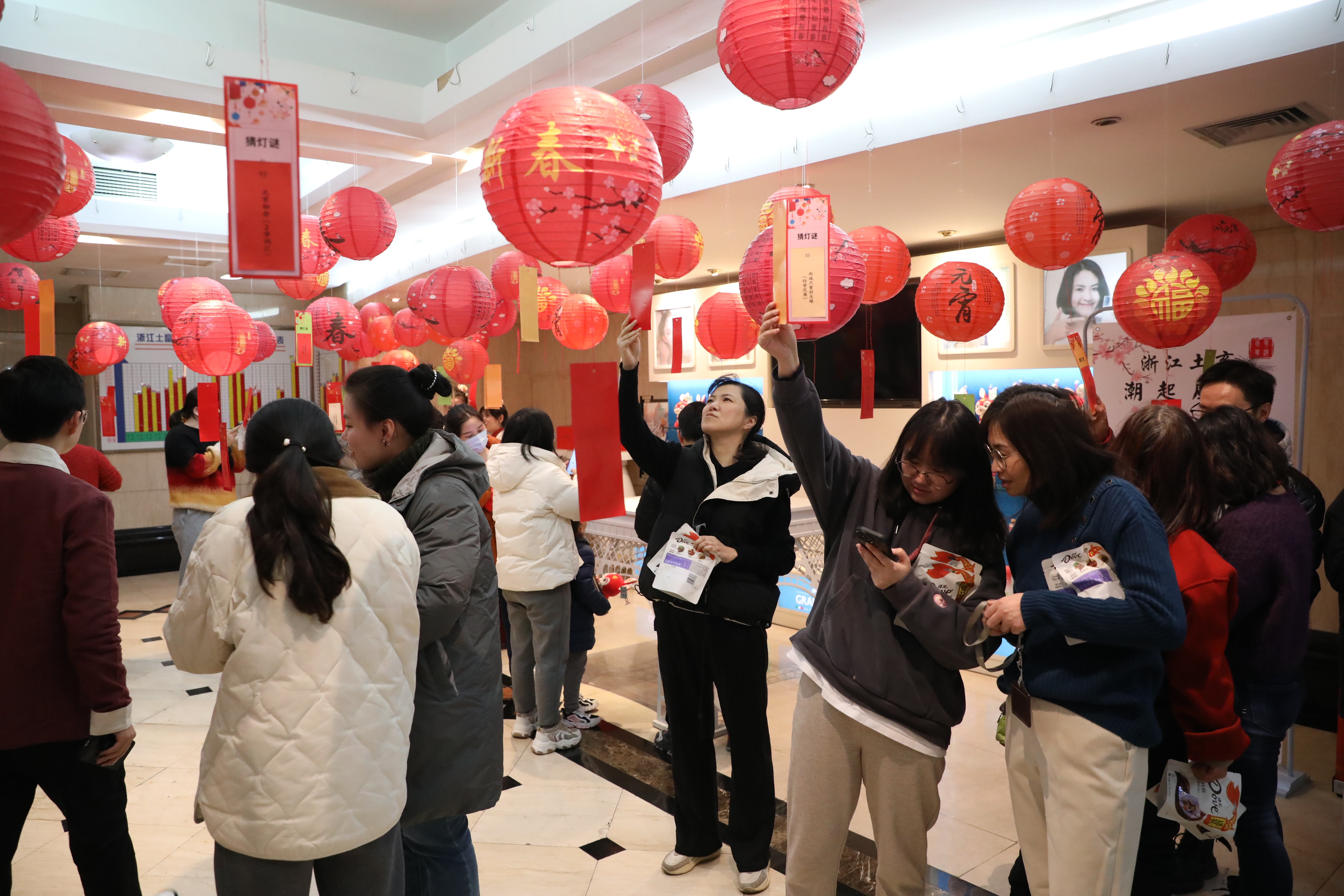 2月3日中午,浙江土畜工會組織開展元宵猜燈謎活動,公司三樓人頭攢動、熱鬧非凡,廳里錯落別致懸掛了一盞盞喜慶的紅燈籠,燈下都有五光十色的謎箋,吸引了許多員工駐足競猜,有的看著謎面低頭沉思,有的與同伴相互討論,領(lǐng)獎桌旁也是絡(luò)繹不絕。紅紅火火燈籠與熙熙攘攘的人群交相輝映,洋溢著濃濃的“土畜年味兒”。